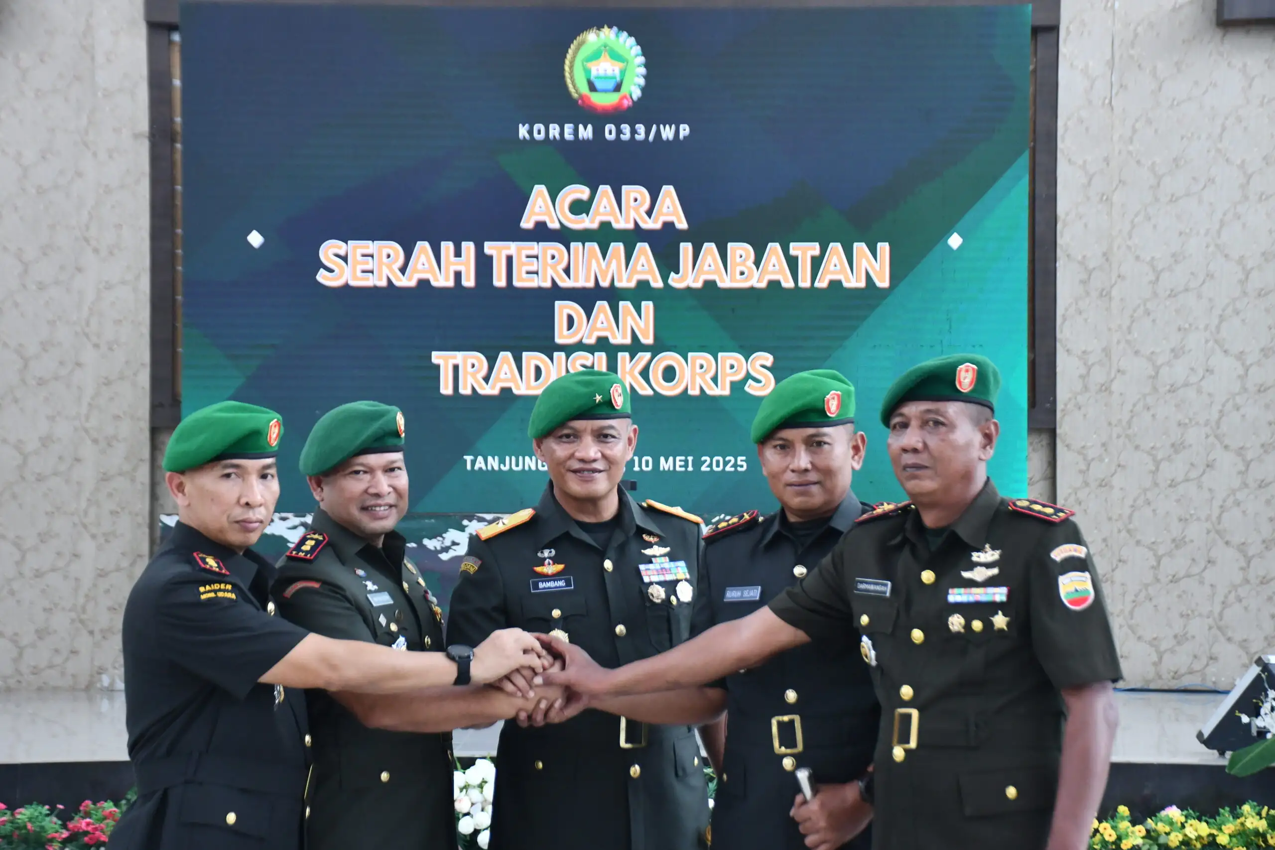 Danrem 033/WP Brigjen TNI Bambang Herqutanto, M.Han memimpin upacara serah terima jabatan (Sertijab) tiga Dandim di Provinsi Kepri, Sabtu (10/5/2025). Upacara sertijab 3 Dandim di Kepri ini dipusatkan di Makorem 033/WP.